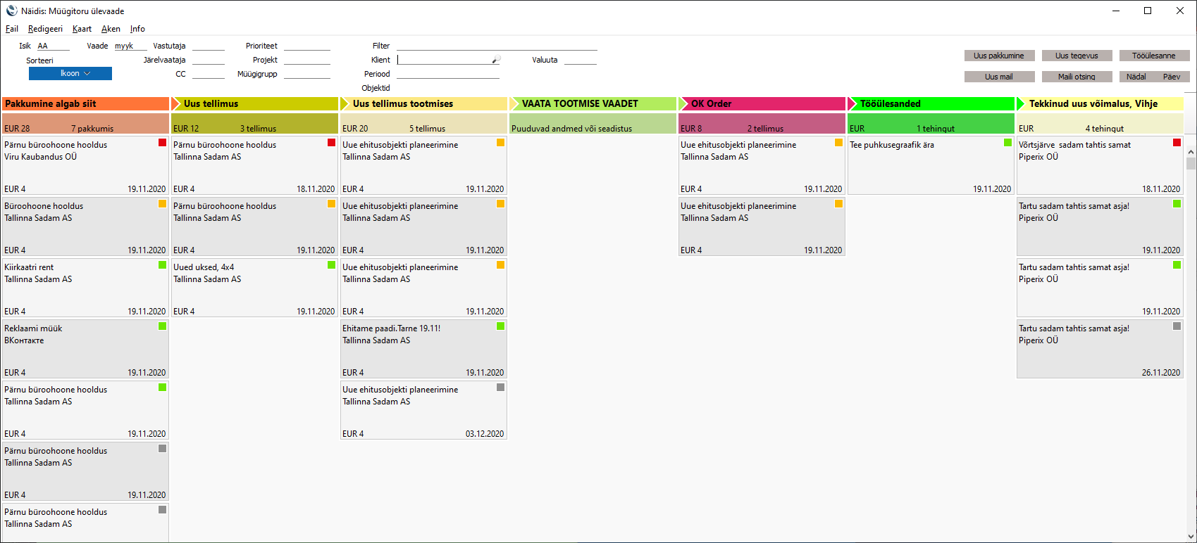 Nii ei pea sa iga tegevuse juurest eraldi kuupäeva otsima hakkama, sest kohe peale vaadates on selge, mis vajab kiiremas korras tähelepanu ja millega on veel aega. Samuti saad nii silma peal hoida sellel, kui mitu tehingut ja mis summas teatud toru faasis parasjagu on. See aitab ettevõttel oma müügitegevust paremini planeerida.